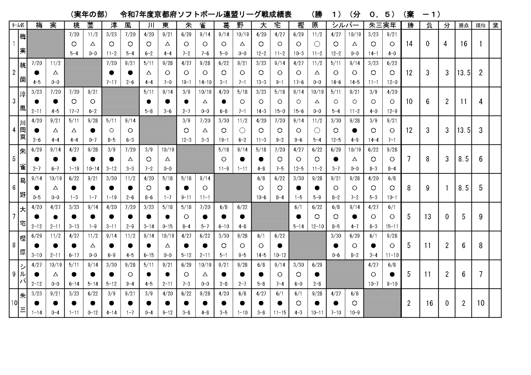 実年の部リーグ戦チーム成績